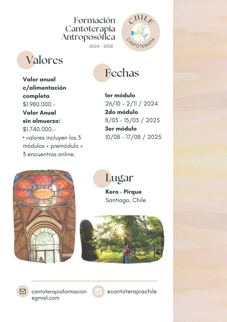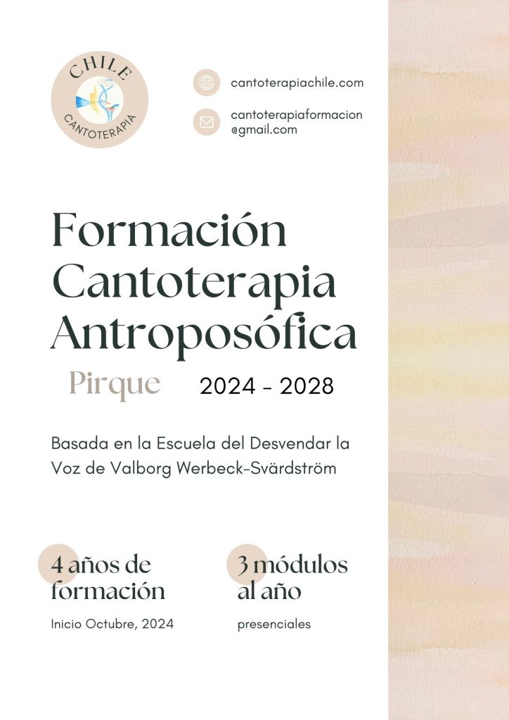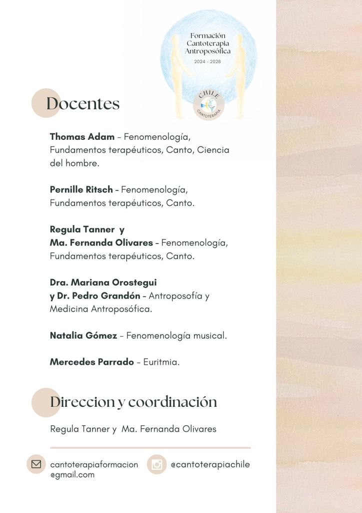 Cantoterapeuta. Actriz especializada en técnica vocal y canto. Desde el año 2005 dedicada a la formación del uso de la voz como instrumento musical, comunicativo y terapéutico. Desde 2011 dirige taller Canto Consciente, atiende consulta particular y se desempeña como docente en diversas formaciones de orientación antroposófica y otras.